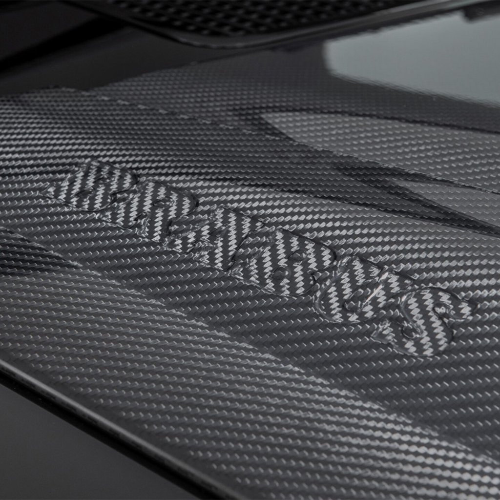 Enhanced safety with striking looks: The carbon roof attachment above the windshield features two powerful auxiliary headlights plus twelve high-performance LEDs on either side, providing optimal illumination of the road when the high beams or headlight flashers are activated.